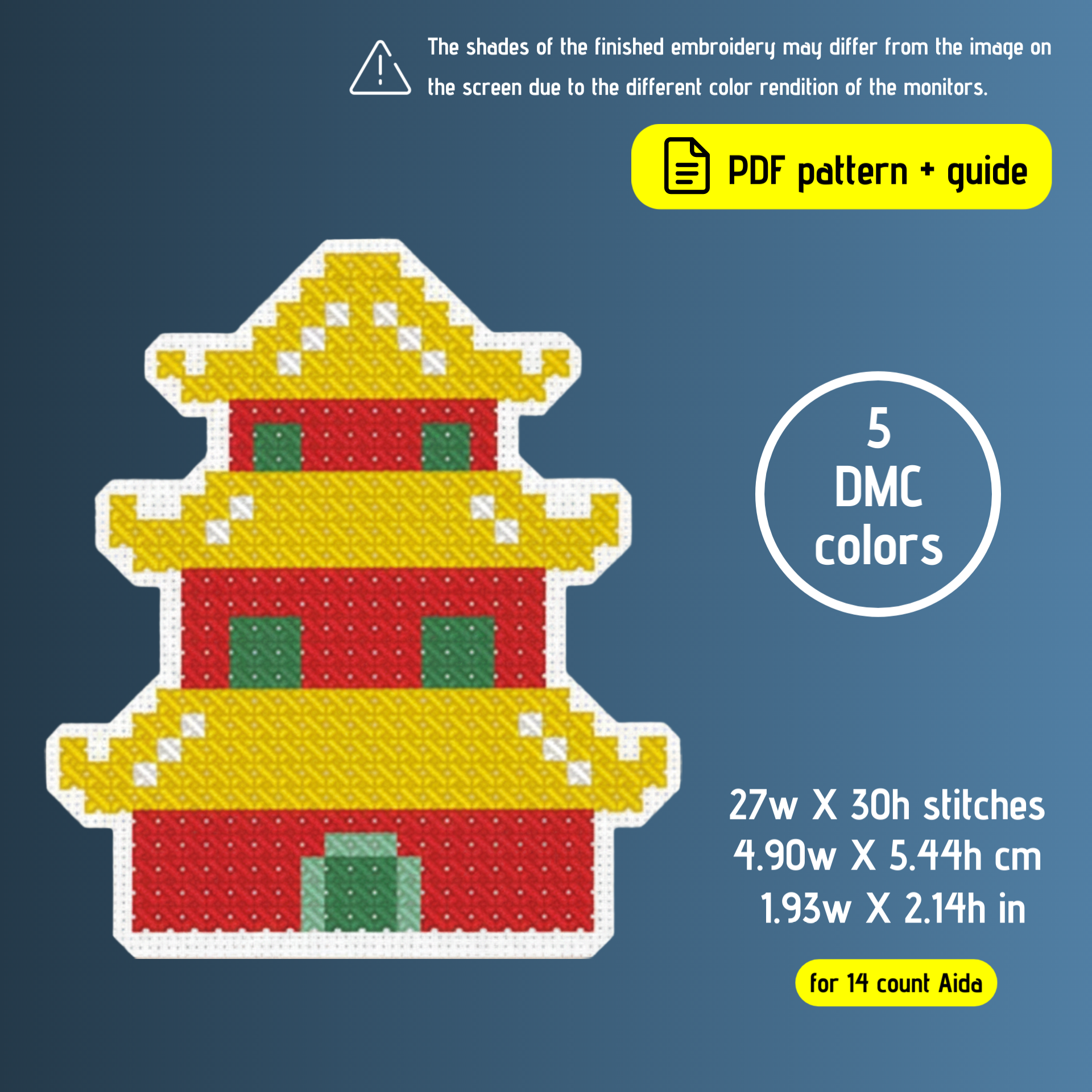 – 4.90w X 5.44h cm | 1.93w X 2.14h inches for 14 count Aida.