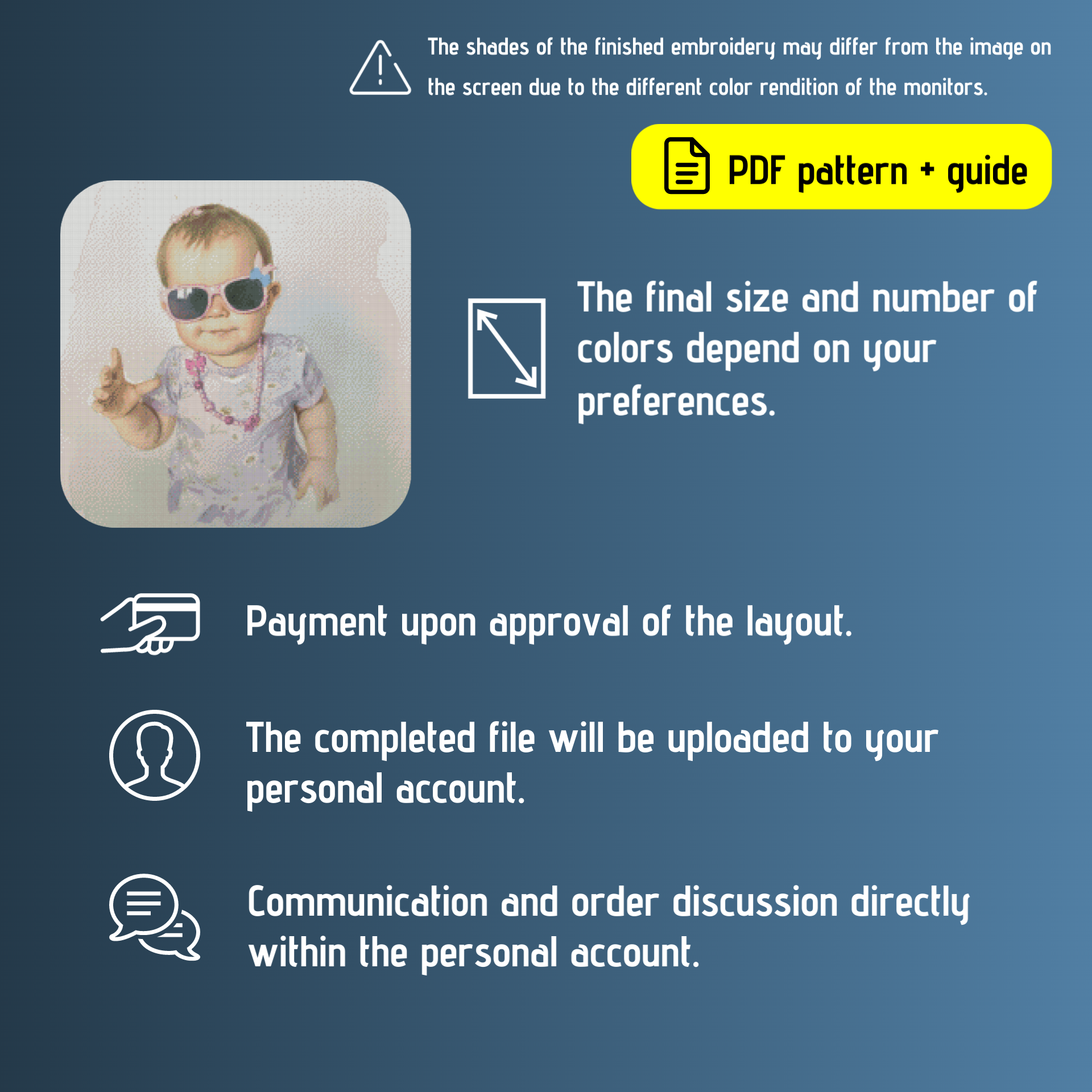 The completed pattern file will be attached to your order in the personal account. This ensures you won’t lose it and can always refer back to it.