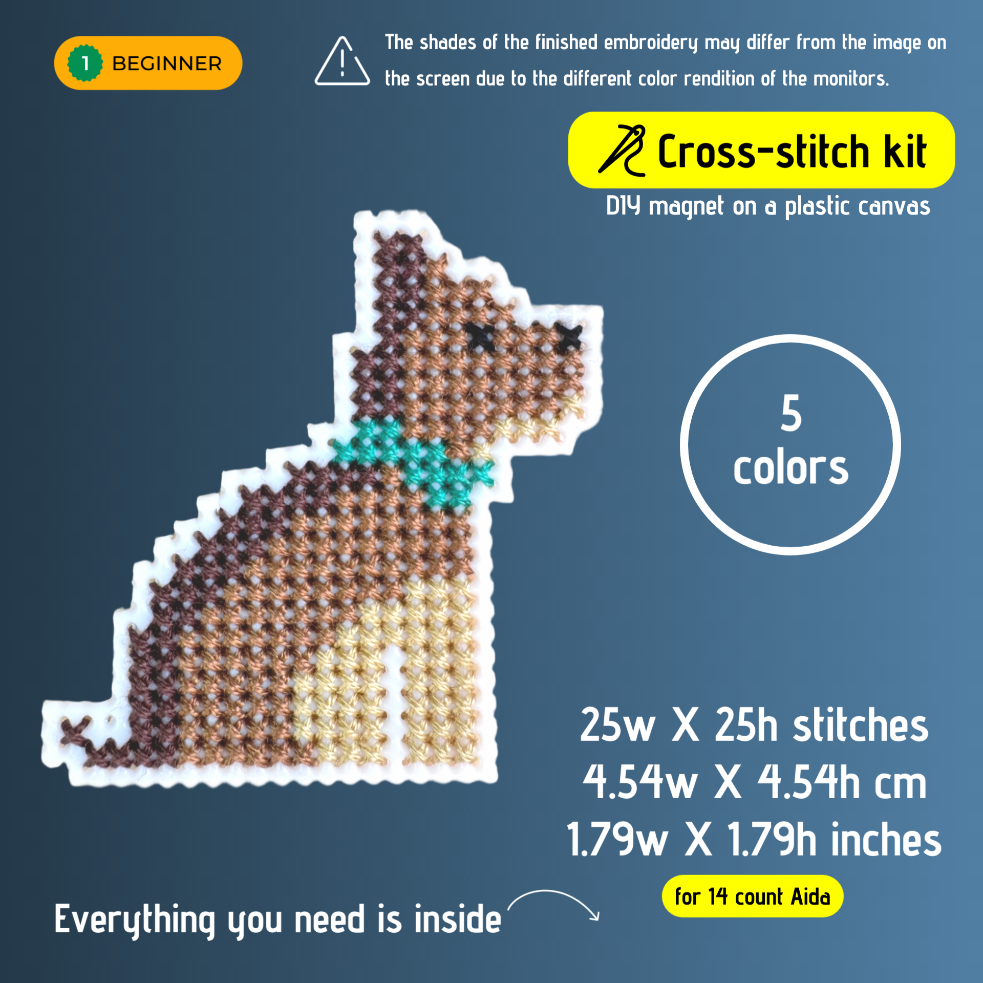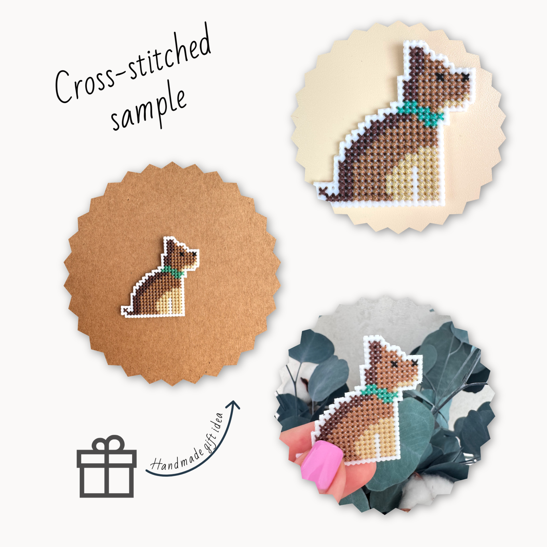 Small cross stitch kit for beginners with a cute dog. Perfect for creating handmade gifts like magnet. Ideal for stress relief and relaxation. Crafting and creativity help manage stress and unwind after a busy day.
